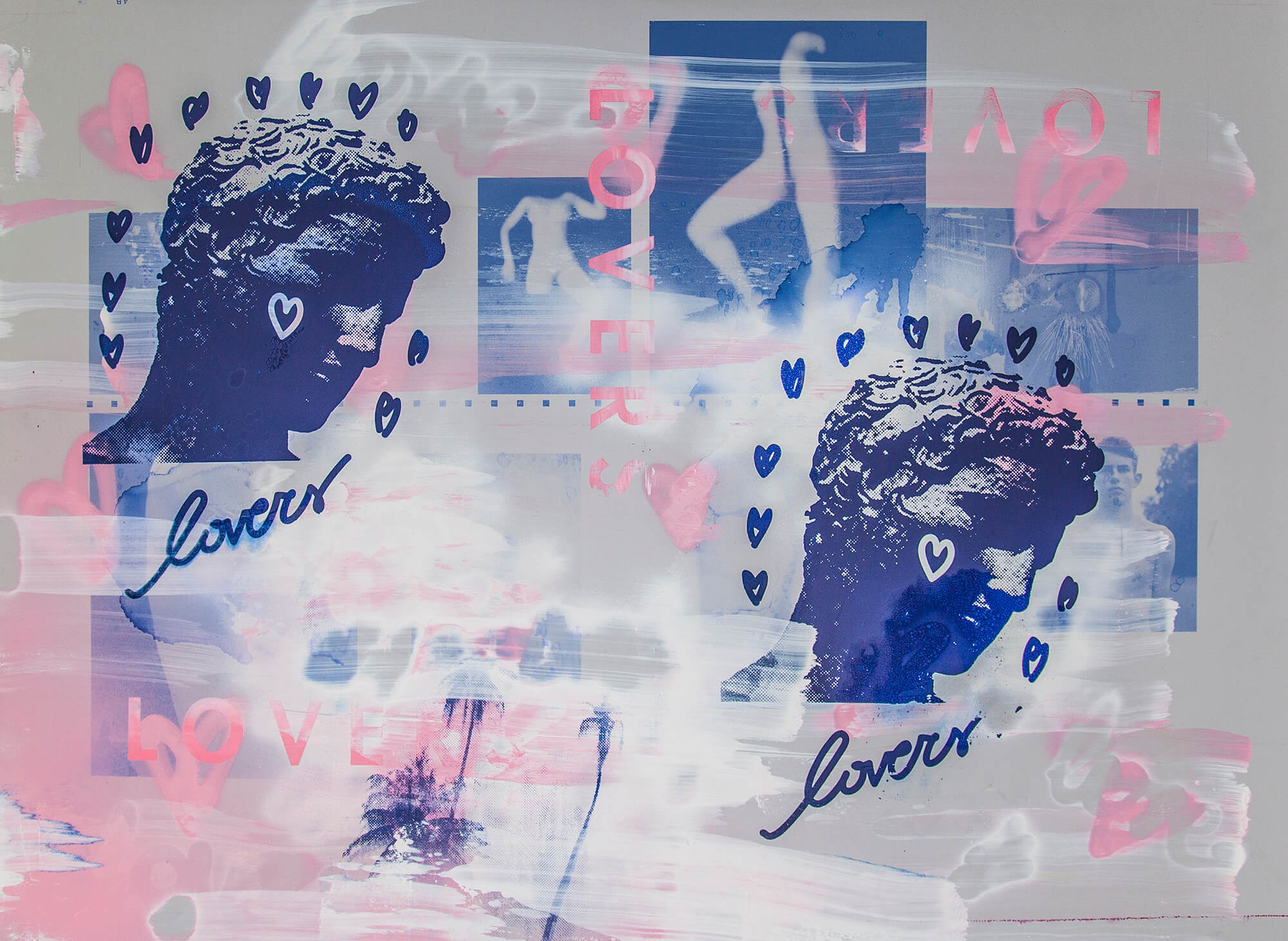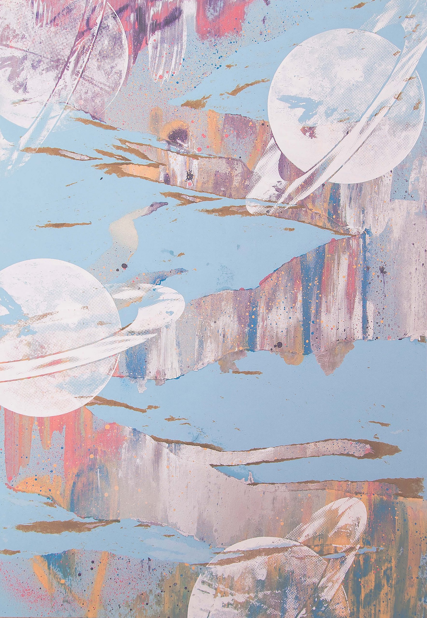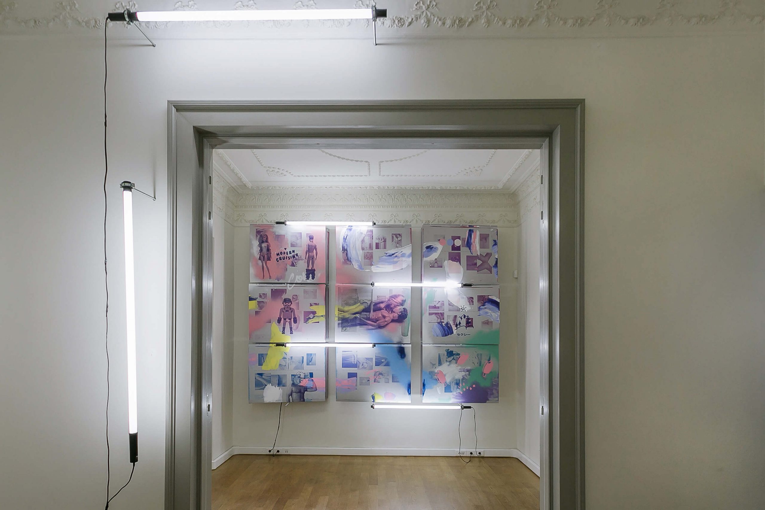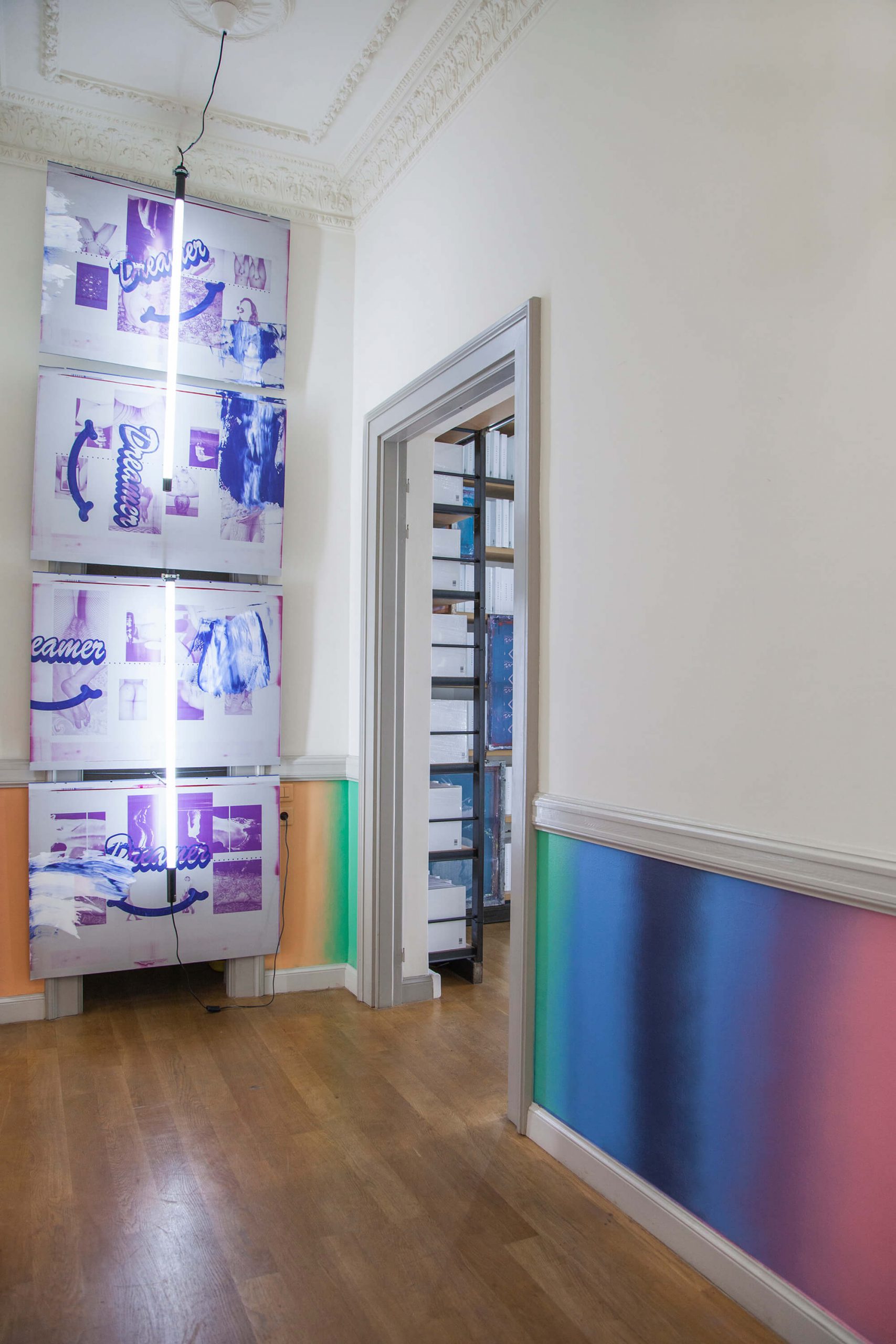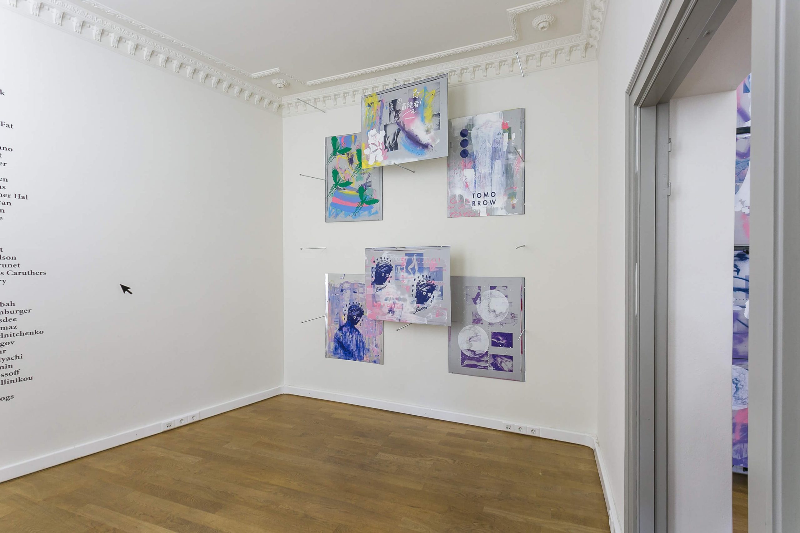In the pink room, there are four old Dreamer prints. These mixed media prints are colorful collages of different papers and are the first artworks maybe with the characteristic Dreamer pastel pallet. Last but not least, these prints have been the inspiration for creating the new artworks for this exhibition.